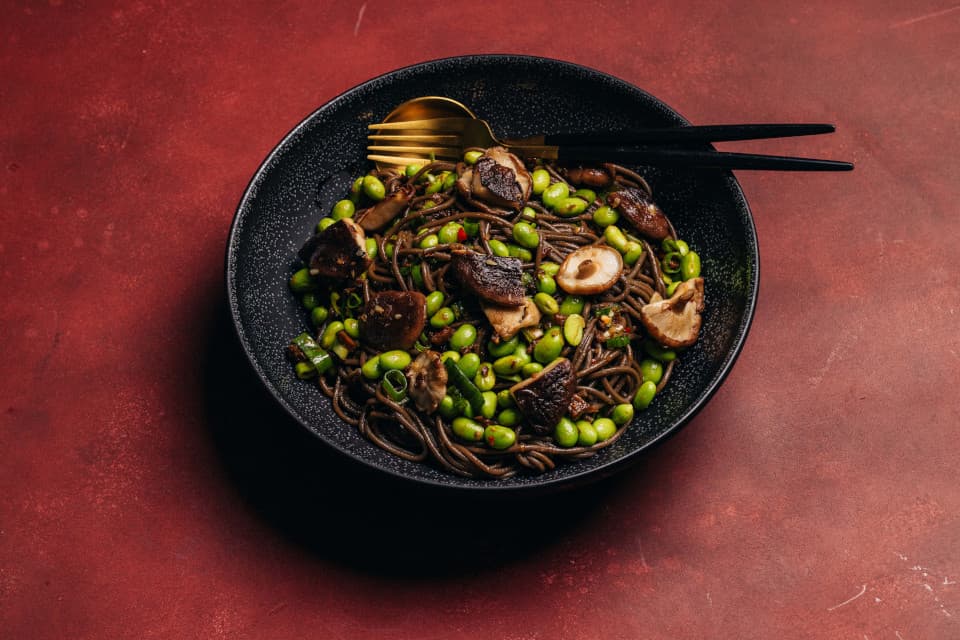 - Forgassuk össze a soba tésztát az elkészített öntettel. Adjuk hozzá a főtt edamame babot és az újhagymát. Díszítsük a pirított shiitake gombával.