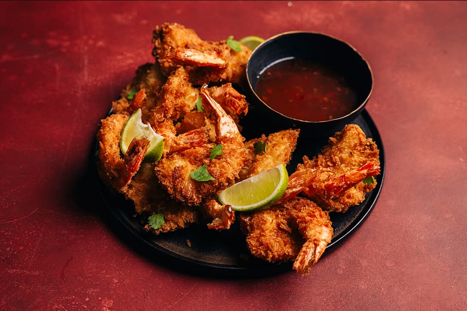Ropogós garnélarák kókuszos-panko morzsában, édes chiliszósszal